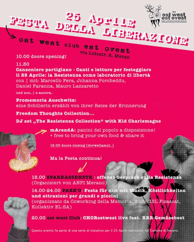 Wir schließen um 15.00 Uhr, damit sich unsere Barkeeper ausruhen können und alle die weiteren Veranstaltungen zum 25. April mitverfolgen können: um 15.00 Uhr in der Sparkassenstr. mit einem von ANPI organisierten „Speakers Corner“ und ab 14.00 Uhr im Park’o mit verschiedenen Attraktionen für Groß und Klein, organisiert von CoWorking della Memoria, SGB/CISL und Kollektiv EL-SA.