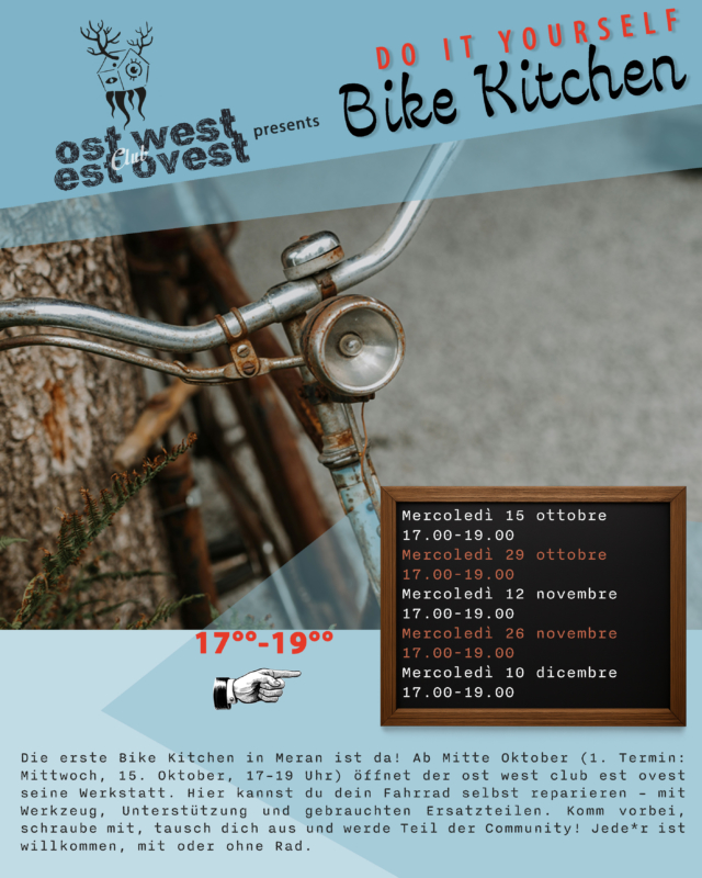 Es ist so weit! Der ost west club est ovest organisiert nach 10 Jahren und unzähligen Repair Cafés nun auch die erste BIKE KITCHEN in Meran! Ab Mitte Oktober (1. Termin: Mittwoch, 15. Oktober 17.00-19.00 Uhr) wird es in der hauseigenen Werkstatt des Clubs vorerst zweimal im Monat eine offene Fahrradwerkstatt geben, in der gemeinsam geschraubt, gebastelt und geflickt werden kann. Bei der ersten Bike Kitchen – dem Auftakt dieses neuen Projekts – laden wir alle herzlich ein, vorbeizukommen, mitzuwirken und den Raum mit Leben zu füllen.